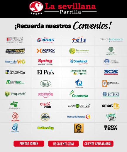Disfruta toda nuestra variedad de platos a la parrilla con un beneficio especial que cada una de estas empresas y La Sevillana Parrilla tienen para ti. Podrás redimirlo en cualquiera de nuestras 18 sedes ubicadas en Cali, Palmira y Jamundí.